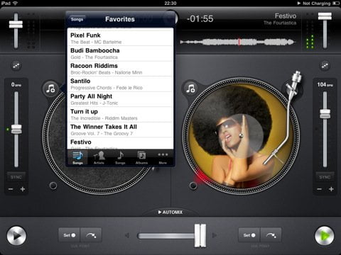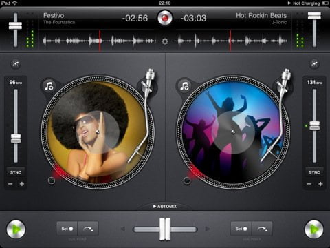 Mit dieser tollen iPad App ist es möglich, Mixe zu erstellen und aufzunehmen oder einfach Live zu performen. Djay hat durch iOS 4.2 vollen Zugriff auf die iPod Mediathek, also könnt ihr alle Lieder verwenden die ihr vorher mit iTunes synchronisiert habt. Diese App wure durch iOS 4.2 erst ermöglicht.