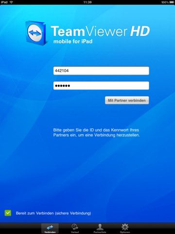 Der Verbindungsaufbau funktioniert über die Eingabe der vom Desktoprechner generierten Partner-ID und dem Sitzungskennwort. Darüber hinaus lassen sich über die Teamviewer-Partnerliste Verbindungspartner aufrufen. In umgekehrte Richtung funktioniert Teamviewer allerdings nicht – vom Desktop aus kann das iPad demnach nicht gewartet werden.