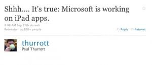 Paul Thurrott, ein bekannter Microsoft Blogger, hat per Twitter verkündet, dass Microsoft zur Zeit fürs iPad Apps entwickelt. … [Weiterlesen...] ÜberMicrosoft entwickelt iPad Apps