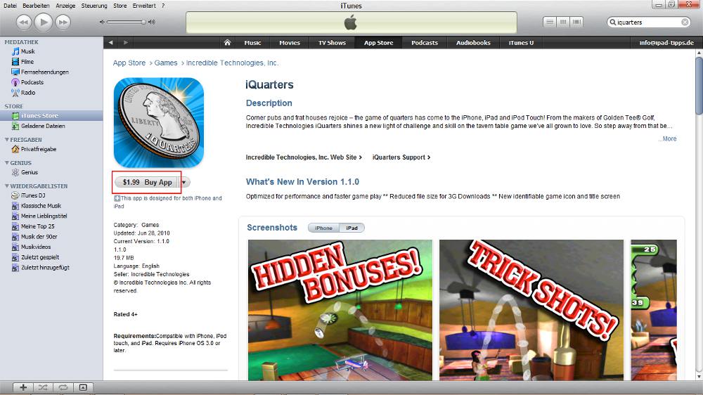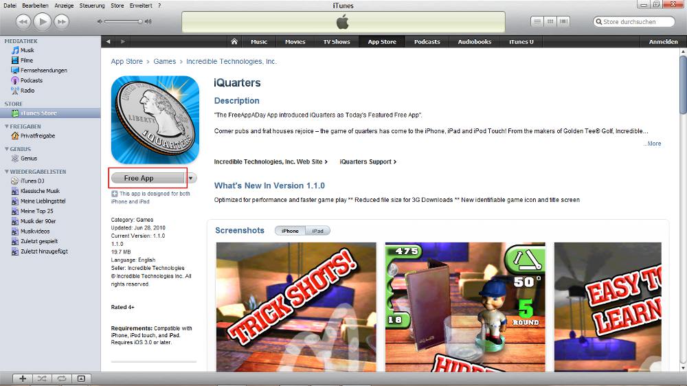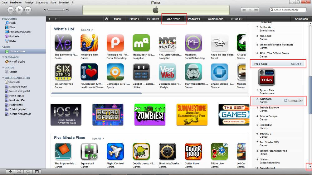 - In den App Store wechseln. Runter scrollen. Auf der rechten Seite, unter „Top Charts – Free Apps“ eine kostenlose App zum Download auswählen (es muss zwingend eine kostenlose iPad App sein, damit man dann keine Bezahlmethode auswählen muss!). Wir haben: „iQuarters„ gewählt. Im nächsten Fenster auf „Free App“ klicken.