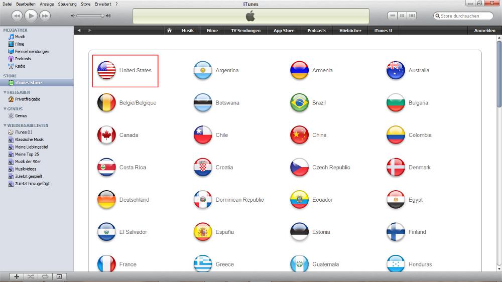 - iTunes starten. Links auf „iTunes Store“ klicken. Nach ganz unten scrollen und unter „Verwalten“ auf „Land ändern“ klicken. In der nun erscheinenden Übersicht „United States“ auswählen.