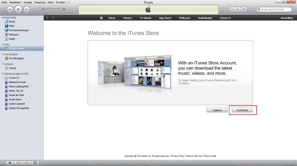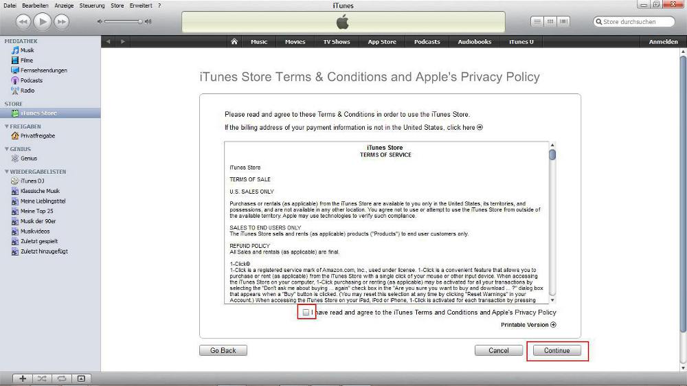 - iTunes AGB bestätigen. Auf „Continue“ klicken.
