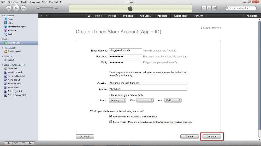 - E-Mail, Passwort und Sicherheitsfrage angeben. Daran denken, dass man eine E-Mail Adresse verwendet, die noch nicht mit iTunes verbunden ist. Auf „Continue“ klicken.