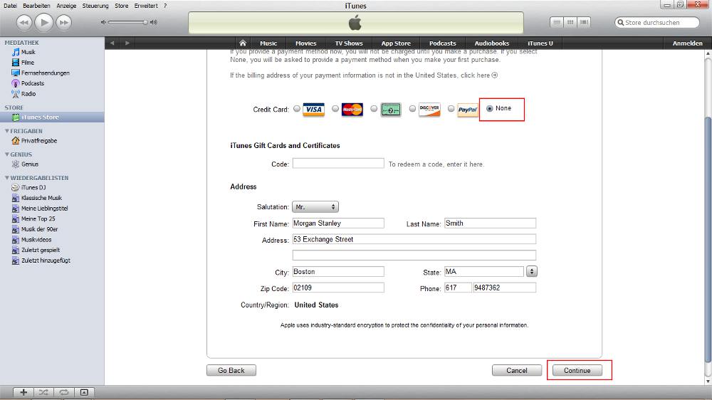 - Bei Zahlweise „None“ auswählen( „None“ bedeutet „Keine“). Bei der Postadresse verwendet man einfach die von weiter oben! Auf „Continue“ klicken.